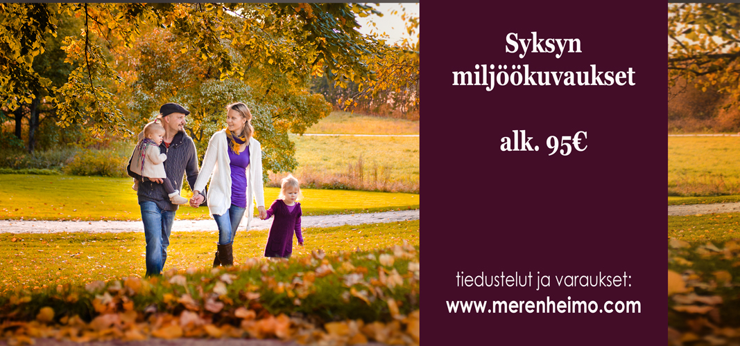 Nyt villapaitaa niskaan ja kaulahuivia kaulaan! Syksyn värit on täällä ja tunnetusti ne eivät kauaa Etelä-Suomessa sellaisina säily. Nyt onkin paras hetki taltioida upeat perhekuvat tai lapsikuvat ulkona. Miljöökuvaukset pääkaupunkiseudulla, Kirkkonummella, Lohjalla, Raaseporissa ja Hyvinkäällä. Ja toki sopimuksen mukaan muuallakin.