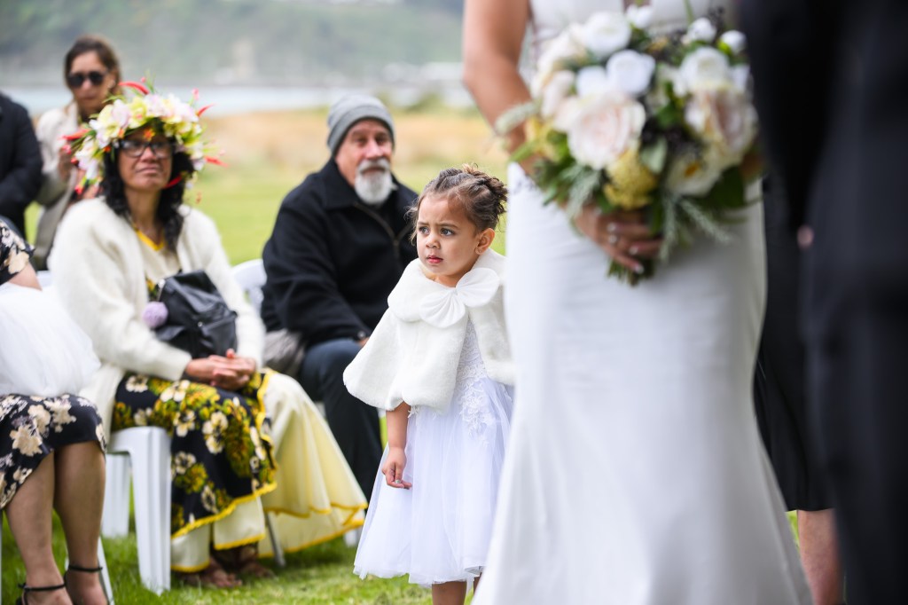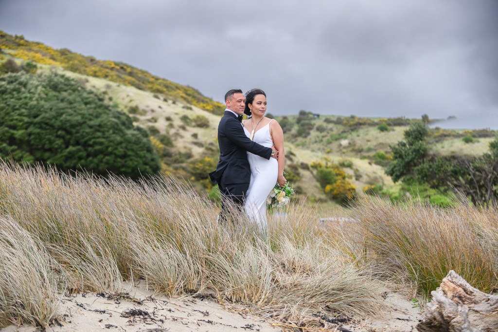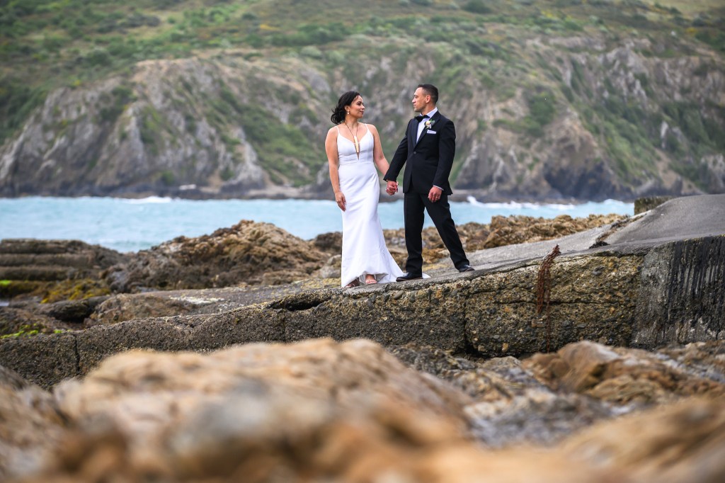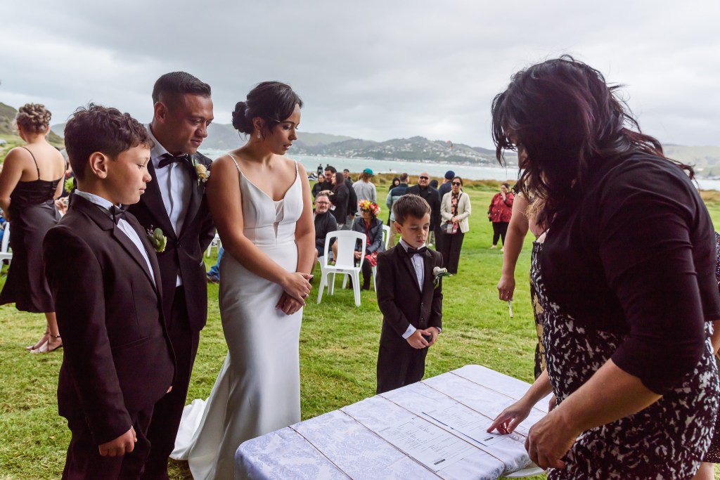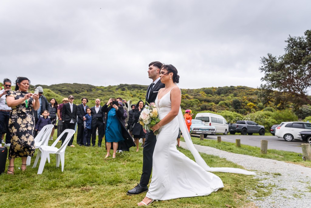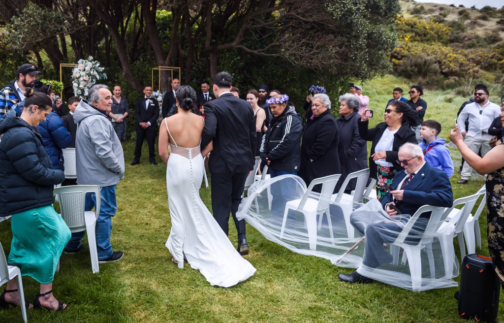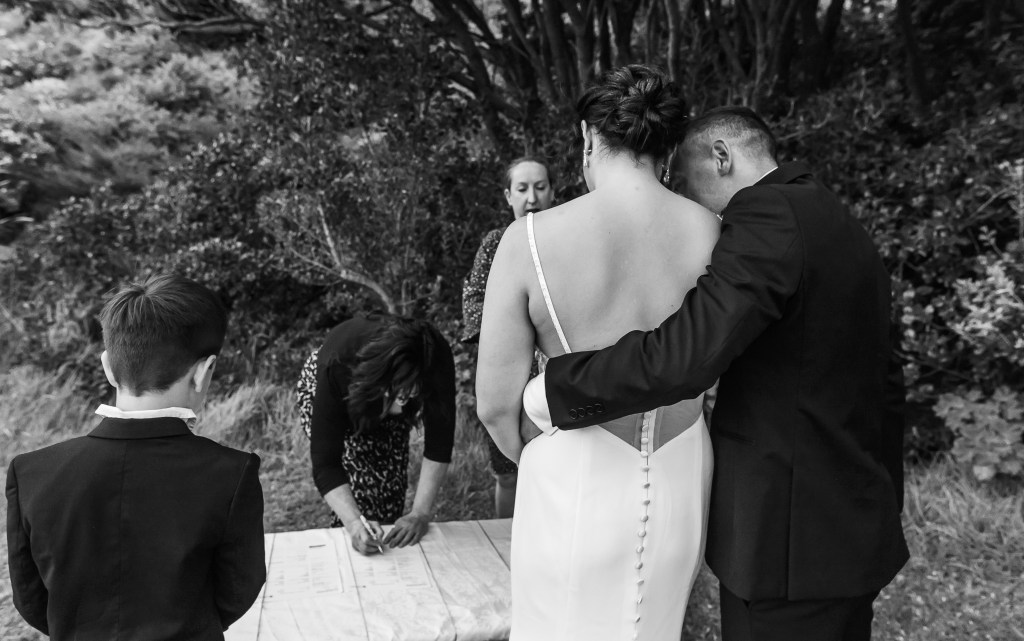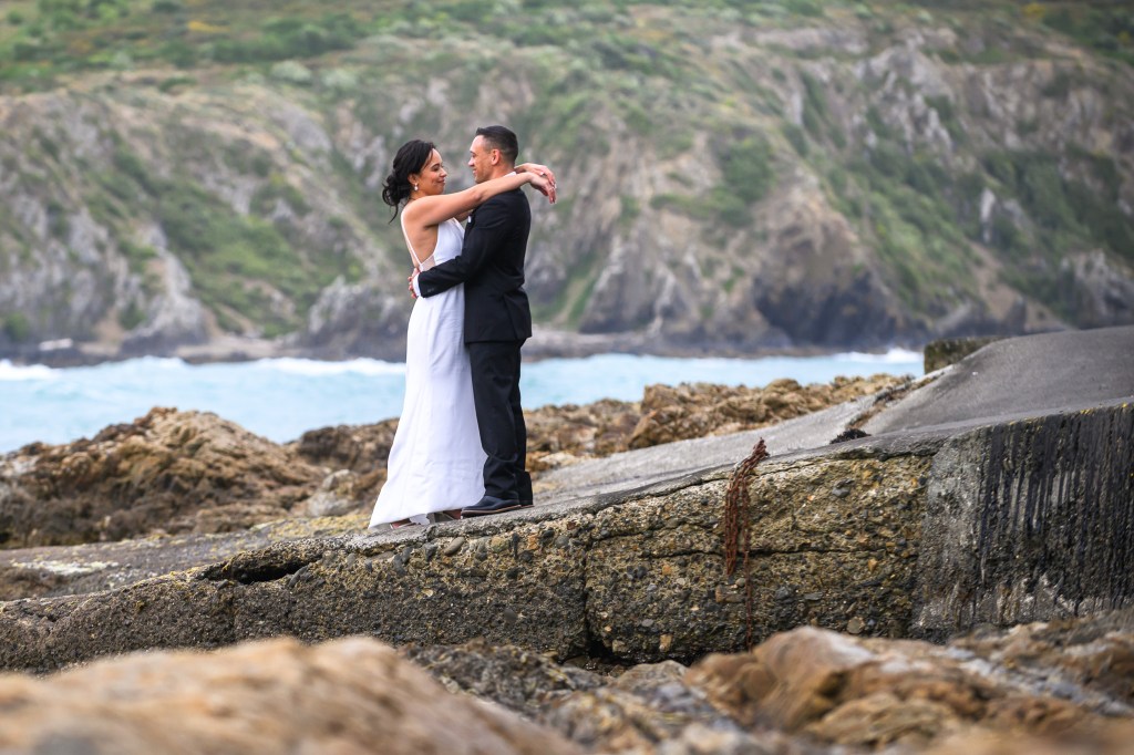 And down the bay, a bit more sheltered corner was found. Still windy, still chilly, but at least no fear of no one been flown off the cliff. And married they got. This beautiful couple, parents of three beautiful children, surrounded by their families and friends. The wind stealing her veil over and over again, the bridal party holding onto flower arrangements, and the celebrant trying to raise her voice over the wind for everyone to hear them saying the magic words.